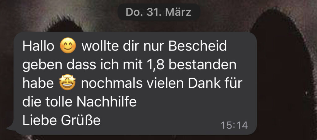 Tom war wirklich meine Rettung für Rechnungswesen. Ohne ihn hätte ich es niemals von einer 4 auf eine super gute 2 (+) geschafft (und das in relativ kurzer Zeit). Er hat Themen sehr übersichtlich und verständlich zusammen gefasst und seine vielen Handouts haben mir geholfen den Stoff zu verstehen. Dadurch, dass er sehr flexibel ist konnten wir immer leicht Stunden zum lernen vereinbaren. Die Nachhilfestunde ist organisiert aufgebaut und er richtet sich völlig nach den Bedürfnissen seines Schülers. Ob gezielte Prüfungsvorbereitung oder Lernen „um am Ball zu bleiben“, Tom kann super erklären (auch für die, die Zahlen eher weniger mögen). Danke für die gute Zusammenarbeit!!