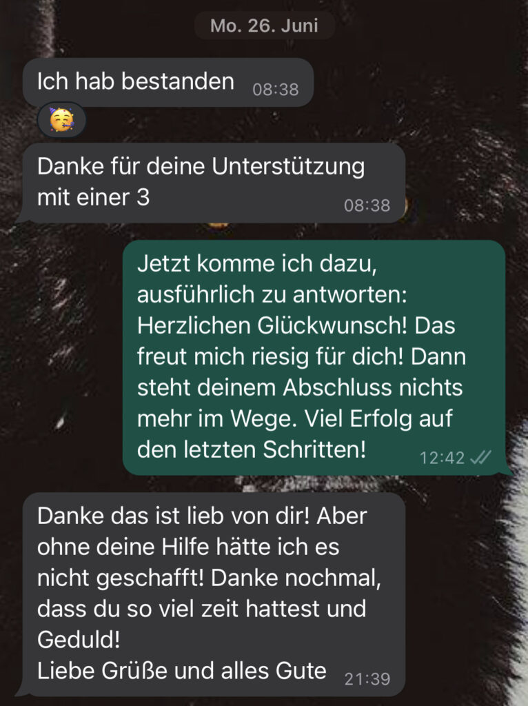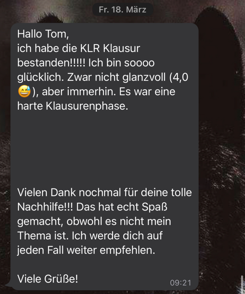 Vor einem Jahr habe ich angefangen, bei Tom Nachhilfe für mein Modul „Buchhaltung und Jahresabschluss“ zu nehmen, da ich mich mit dem coronabedingten Fernstudium etwas schwer getan habe. Tom konnte mir die Inhalte sehr gut und einfach erklären, und jegliche Fragen, die ich hatte, immer beantworten. Die Nachhilfe, in der wir unter anderem übersichtliche Zusammenfassungen erarbeitet und diverse Übungen gemacht haben, hat mir die Klausurvorbereitung erheblich erleichtert. Auch in dem folgenden Semester habe ich daher beschlossen, Toms Nachhilfe weiterhin zu nutzen, diesmal für das Modul „Kosten- und Leistungsrechnung“, und es nicht bereut.
