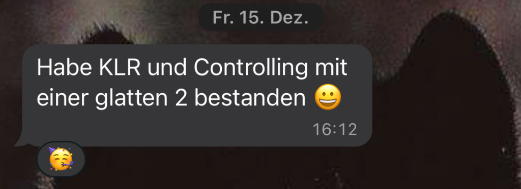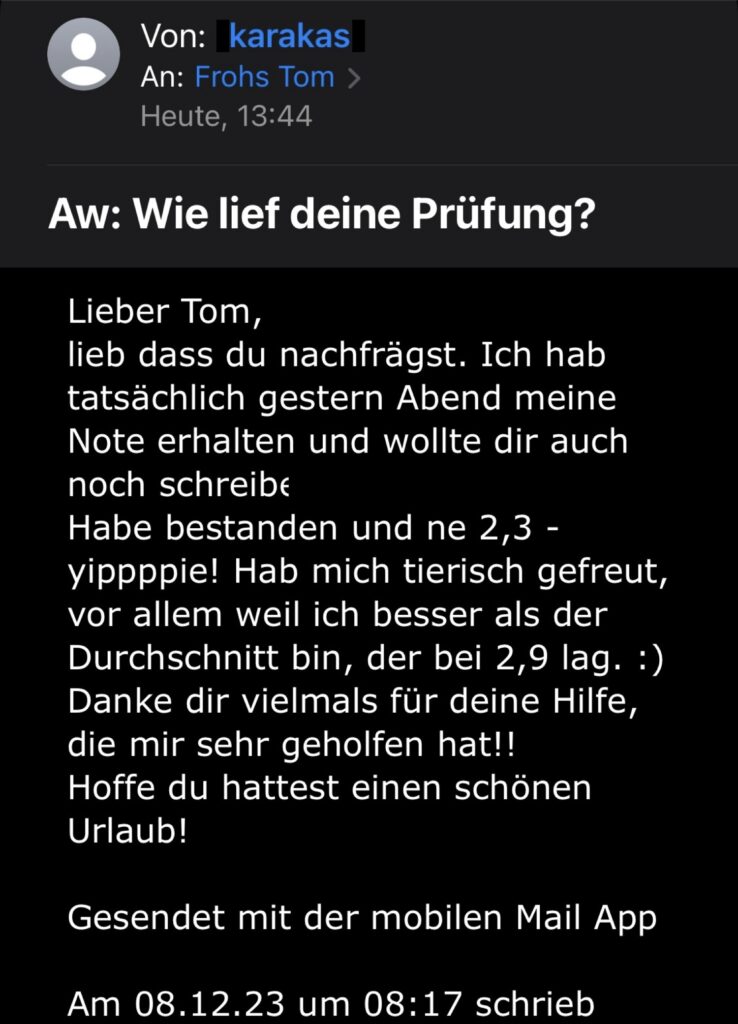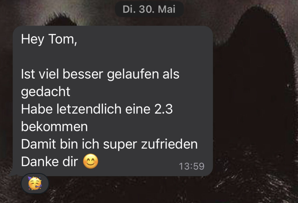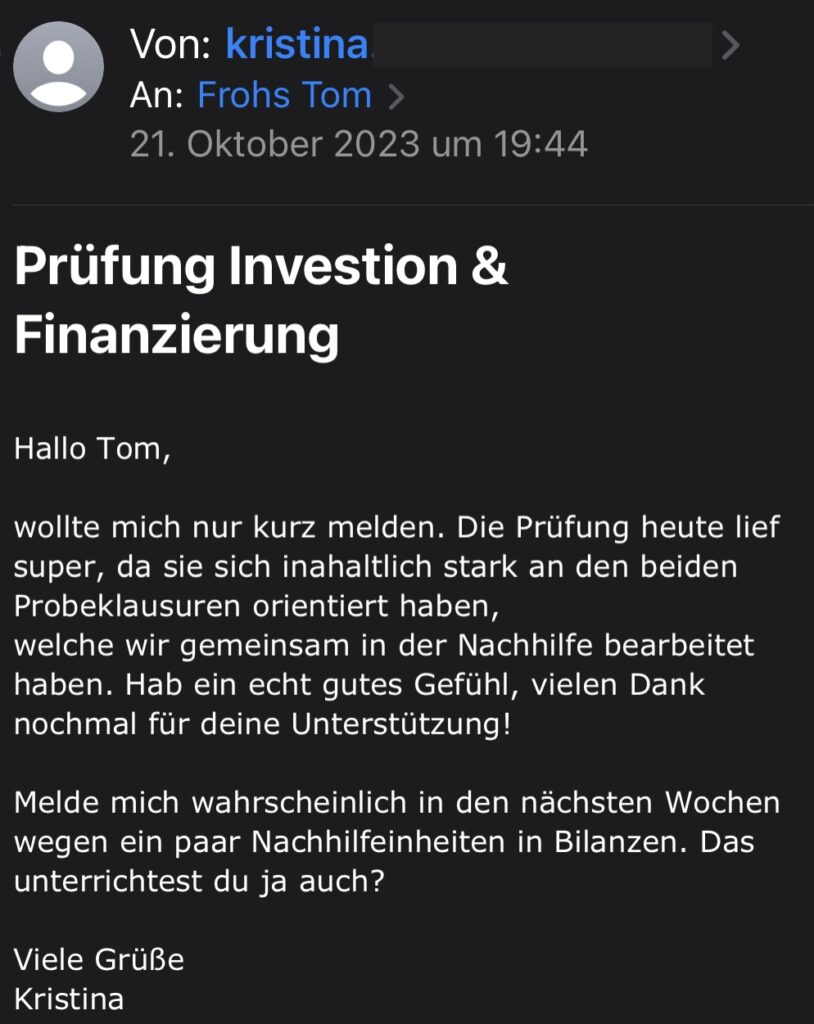 Ich habe die Klausur ‚financial Accounting‘ bis zum Ende meines Studiums aufgeschoben, weil Buchhaltung wirklich ein Graus für mich ist. Tom hat mir sehr in der Klausurvorbereitung geholfen! Er konnte mir alle aufkommenden Fragen beantworten und war nie davon genervt mir Inhalte noch ein drittes Mal zu erklären. Außerdem hat er eine sehr aufgeschlossene Persönlichkeit und einen super Humor. Ich habe es definitiv ihm zu verdanken, dass ich eine 1,3 geschrieben habe. Vielen Dank!